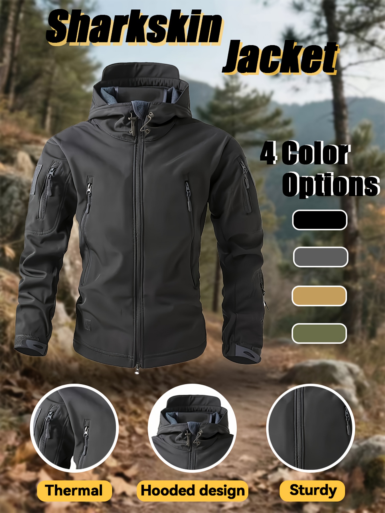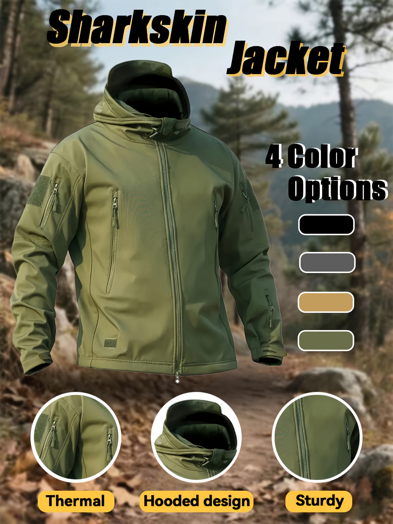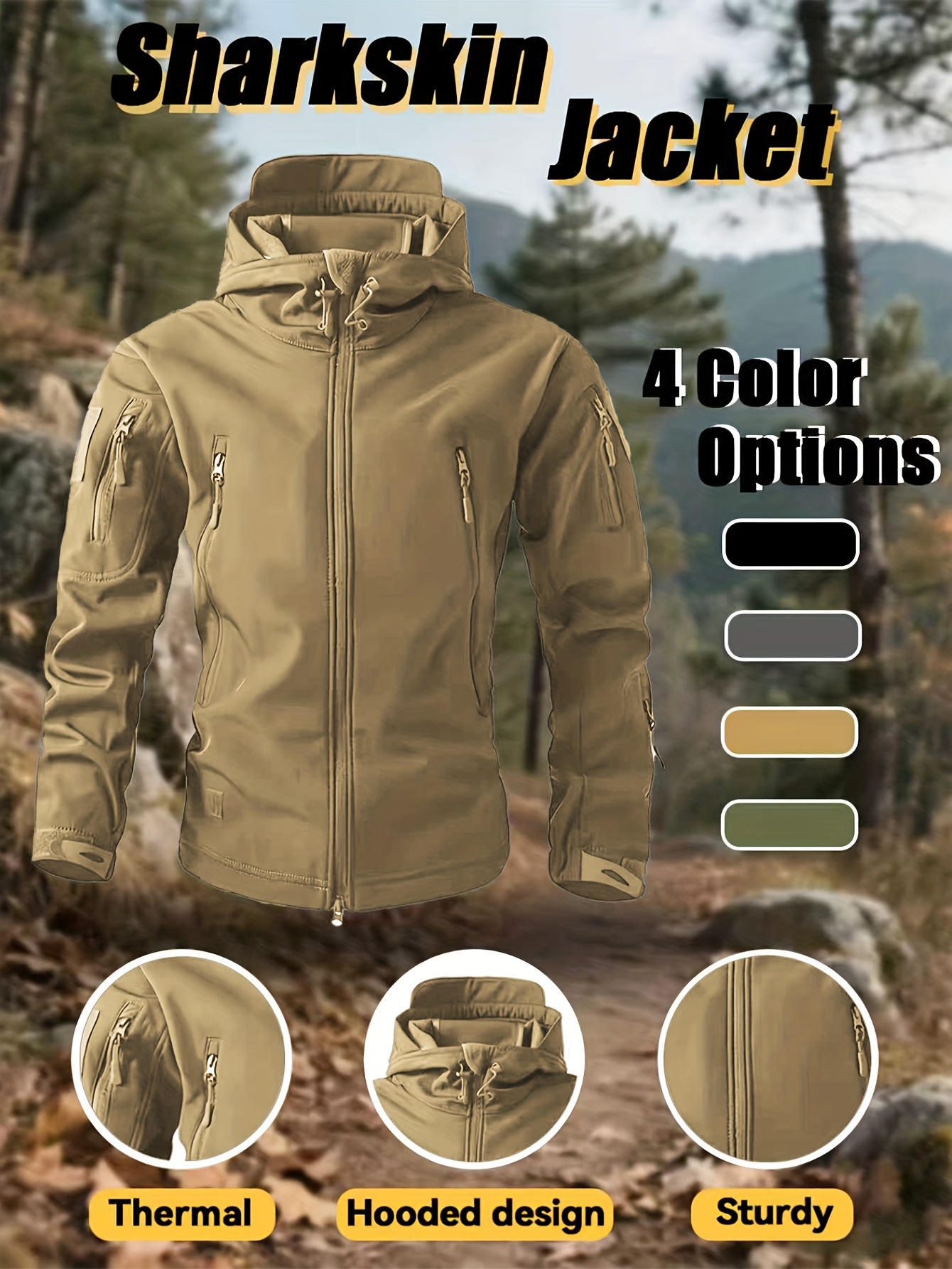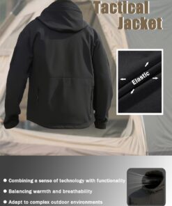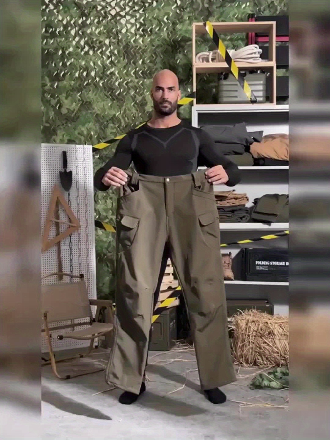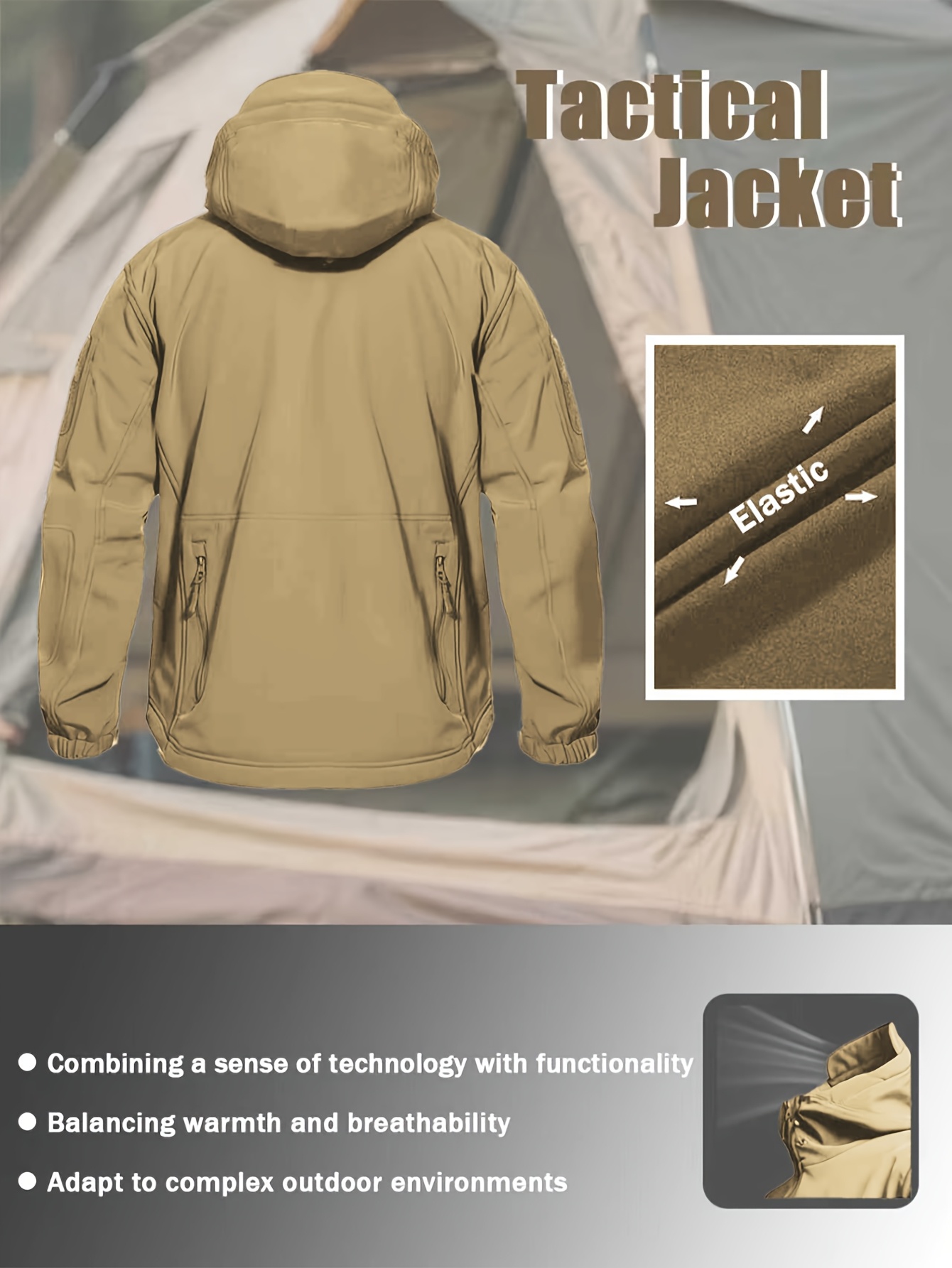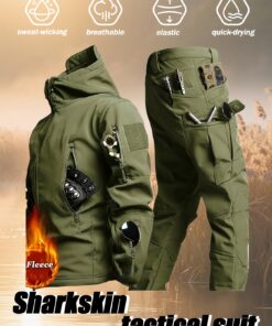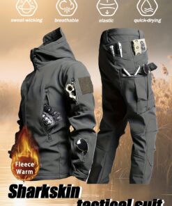 New thickened two-piece set for men for autumn and winter, featuring a windproof jacket with multiple pockets and a sweatshirt, made of fleece material for both the jacket and pants, offering elasticity and warmth, ideal for activities like hiking, skiing, and fishing.